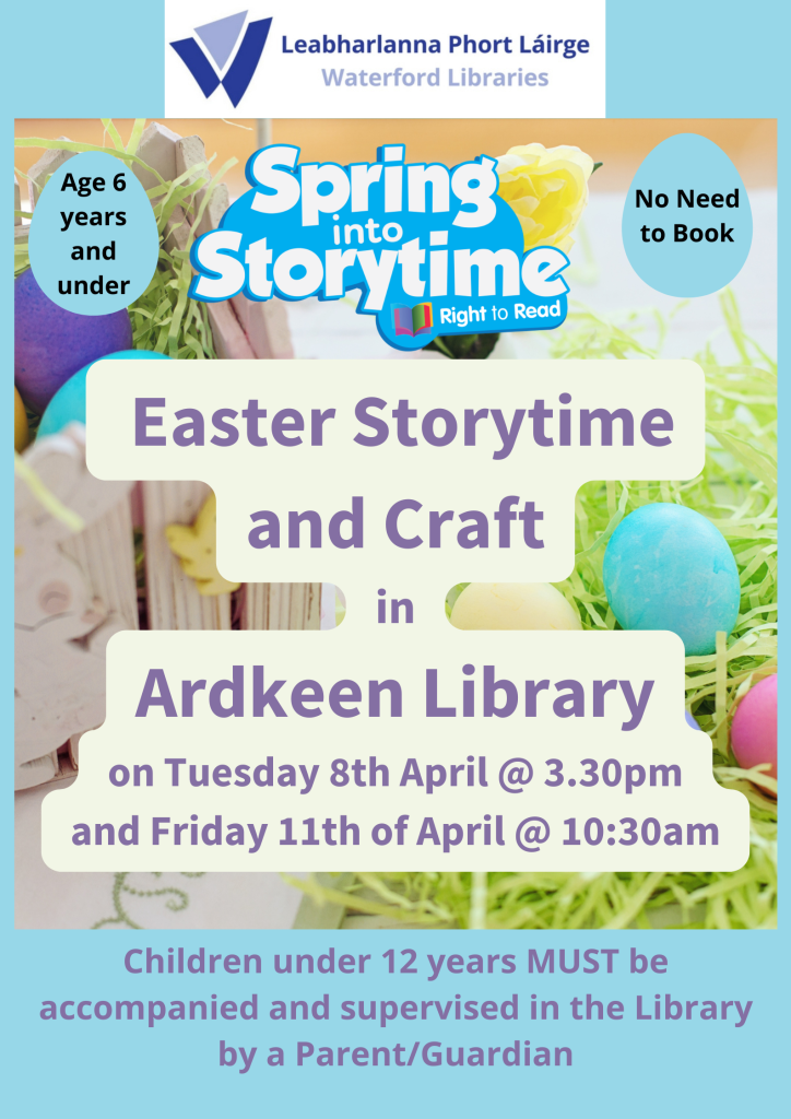 Drop in to an Easter Storytime and Craft in Ardkeen library. All welcome but children aged under 12 years must be accompanied by a parent or guardian.