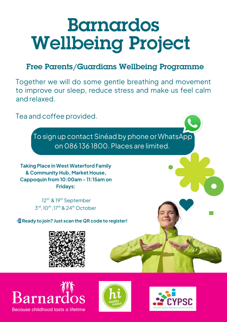 Barnardos, in partnership with Healthy Ireland and CYPSC, are running a gentle wellbeing programme in Cappoquin. Together weâll explore simple breathing and movement practices to improve sleep, reduce stress and support calm and relaxation.