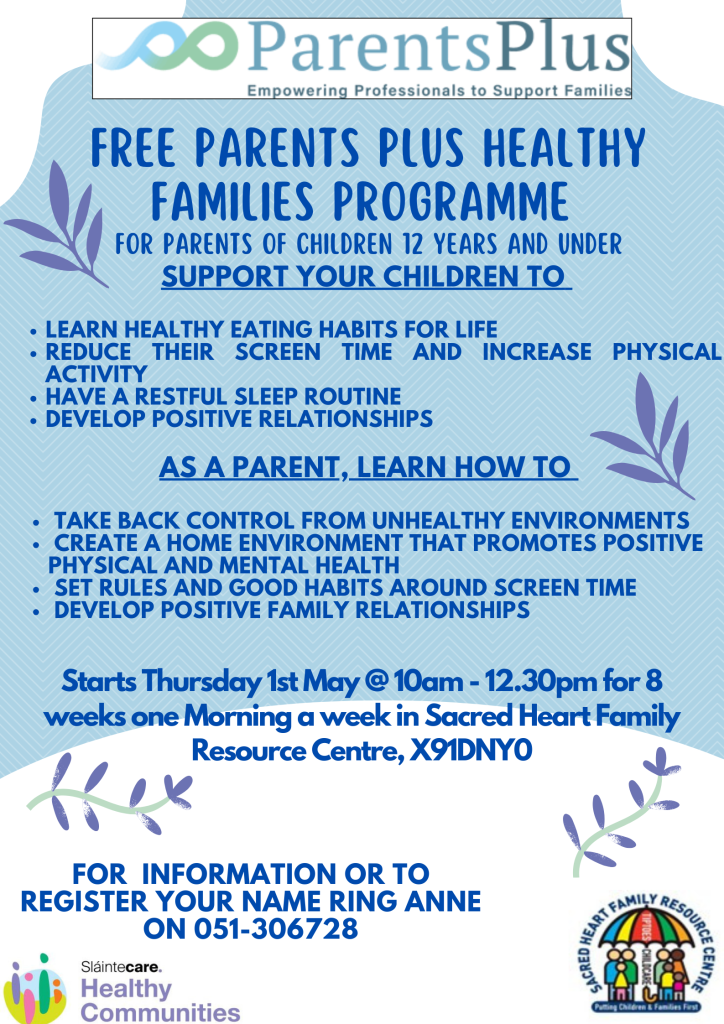 This FREE programme is for parents of children 12years and under, if you would like help to support your children with establishing new healthy habits, reduce screen time, develop positive relationships and so much more (please see attached poster) then why not register for this 8 week programme one morning a week.