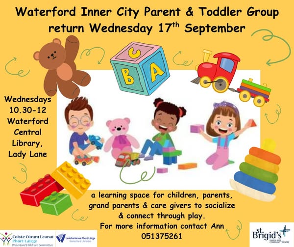 Why not come along to the Waterford Inner City Parent and Toddler Group — a relaxed, fun and welcoming environment where parents, grandparents and care givers with babies and toddlers can enjoy free play and chat with one another. There are also opportunities for information talks to learn about child development.